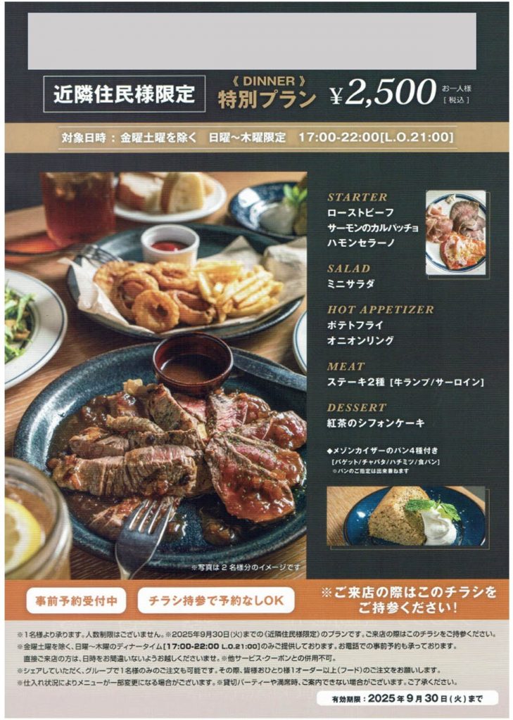 平日限定のディナーコース(2,500円/税込)を紹介するチラシを、タワーマンションが集中する周辺エリアの住民に向けて配布しました。