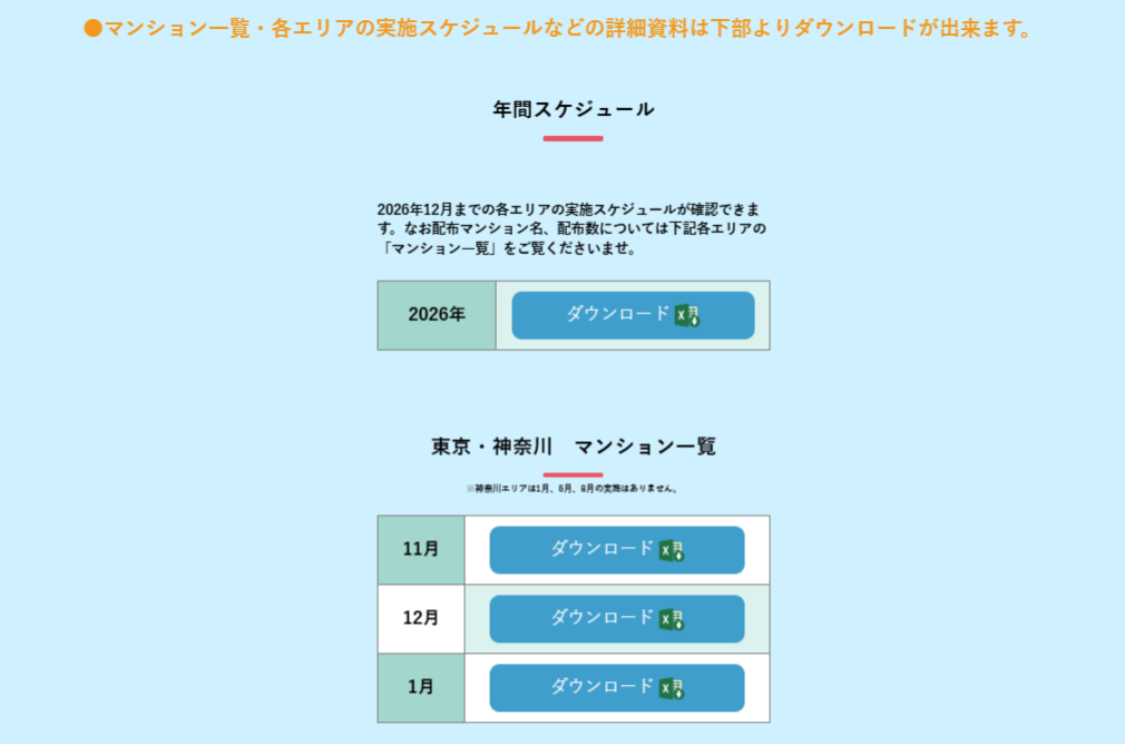 どのエリアにいつ配布を実施するかの年間スケジュールの表もあるので、配るタイミングを先に調べたい方はそちらをご覧ください。