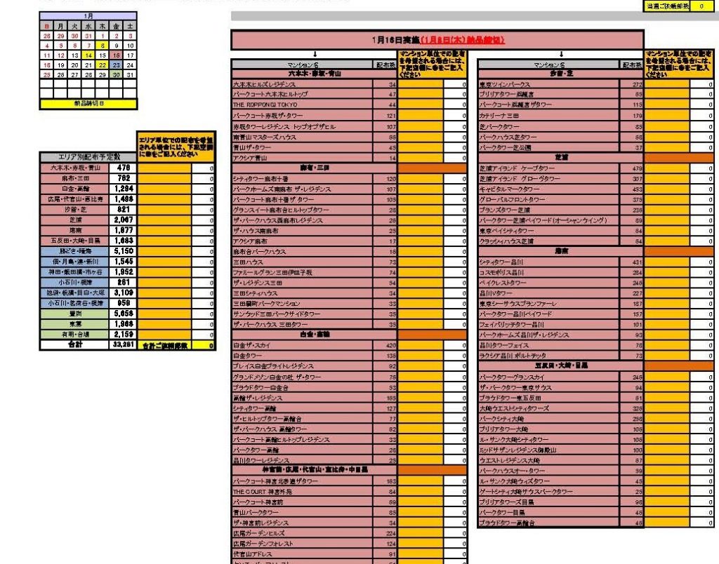 弊社のHPからダウンロードできる各エリアごとのマンション一覧(エクセル)を見ながら、「このエリア(またはこのマンションに」「何部配りたいか」を決めます。